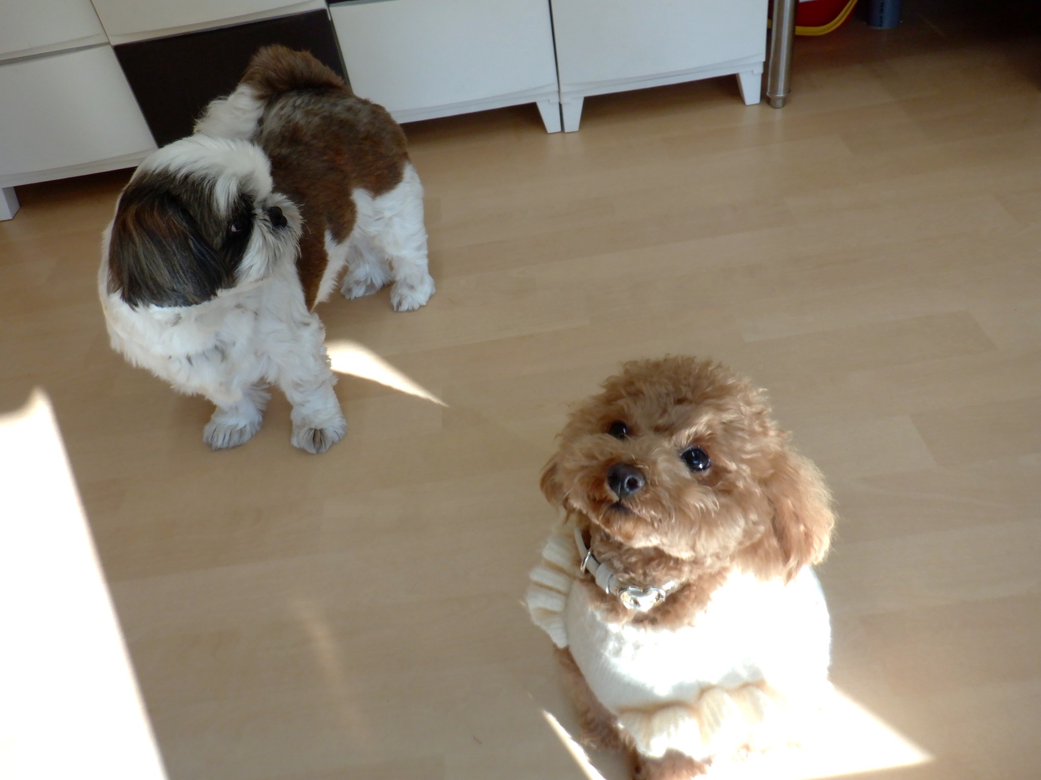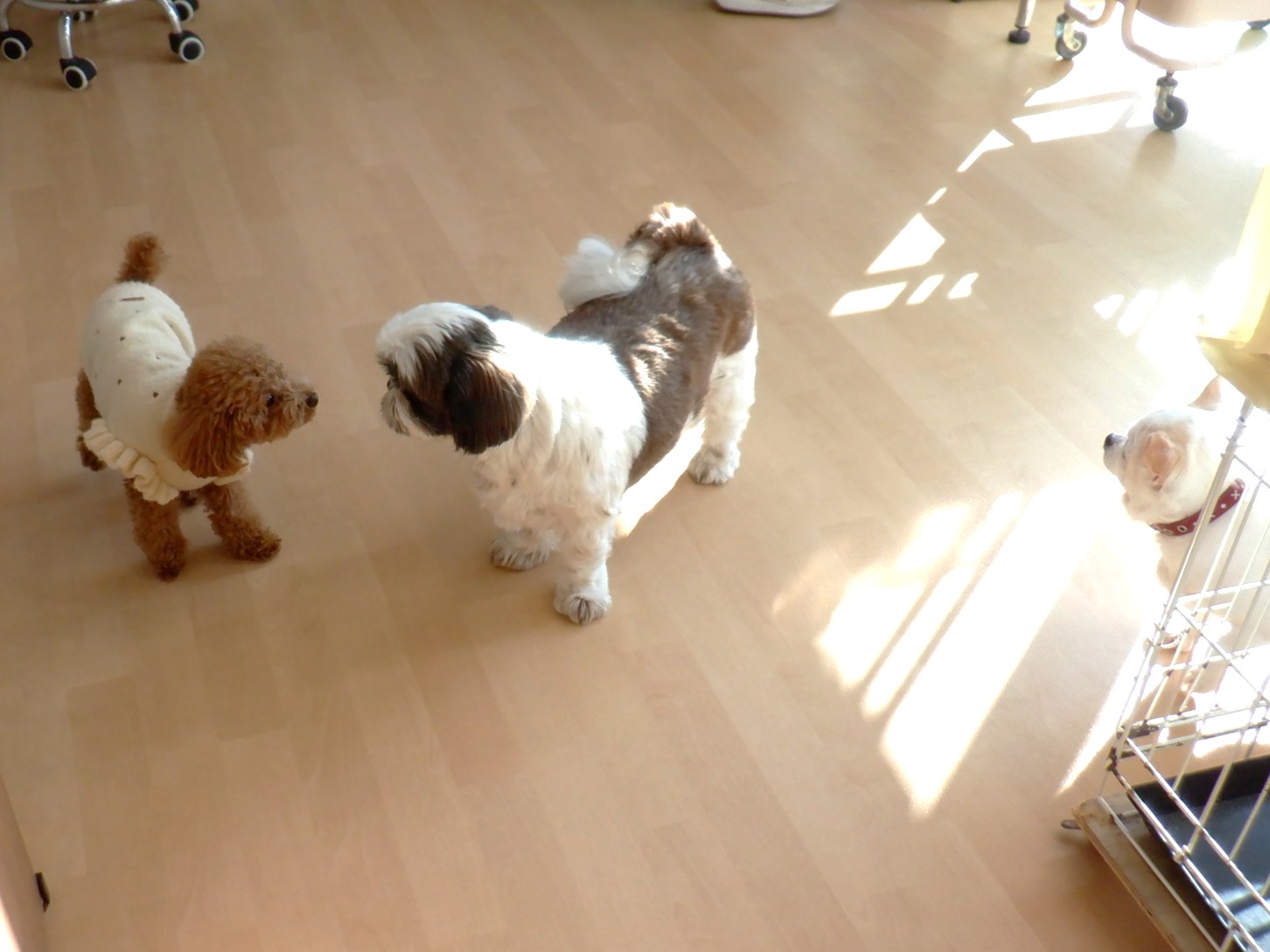 今日のお預かりは、ツキちゃん・サクラちゃん・プティちゃん・ゴマシオちゃんです。ツキちゃんの朝一の散歩は、日の出まえでした。サクラちゃんは朝ごはん前なので、すぐに帰ろうとします。プティちゃん・ゴマシオちゃんは一緒に過ごしています。