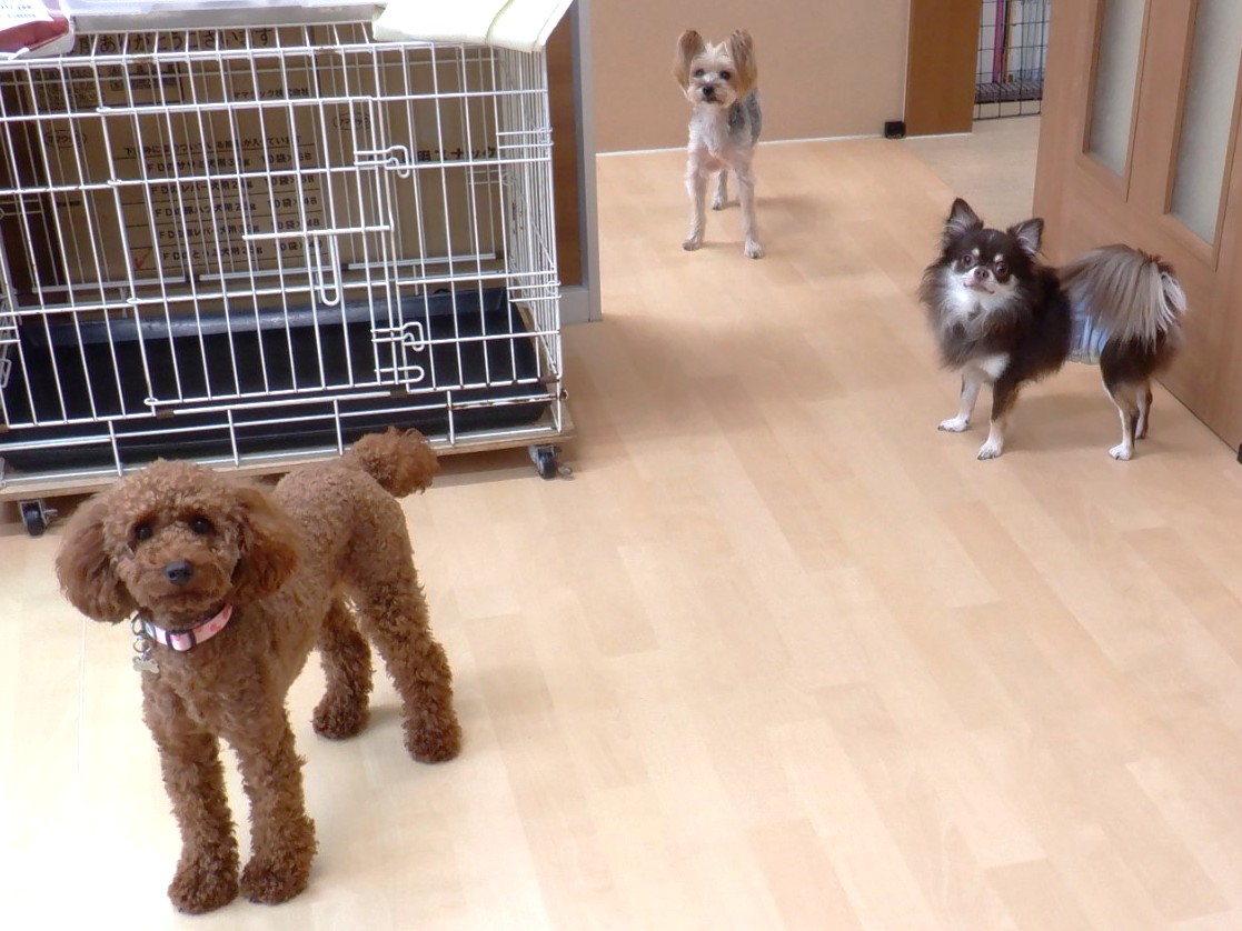 今朝は雨なので、ドッグランはありません。今朝チェックインしたモモちゃん、お泊りしたアニーちゃん・ロンちゃん・サクラちゃんは起床後からすぐに、オープンスペースに一緒にいます。猫のこつぶちゃんは、慣れてくれましたが、段ボールの中が落ち着くようです。