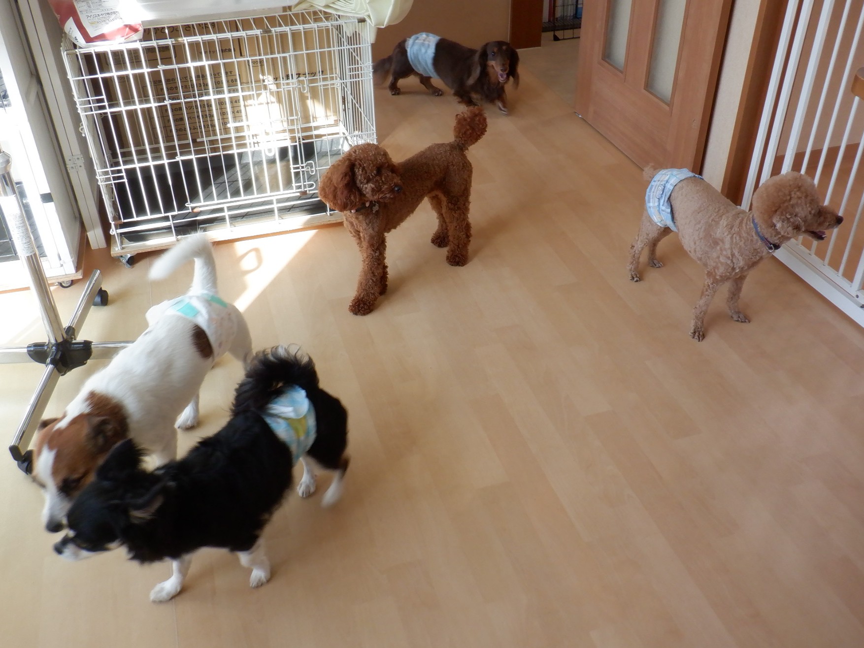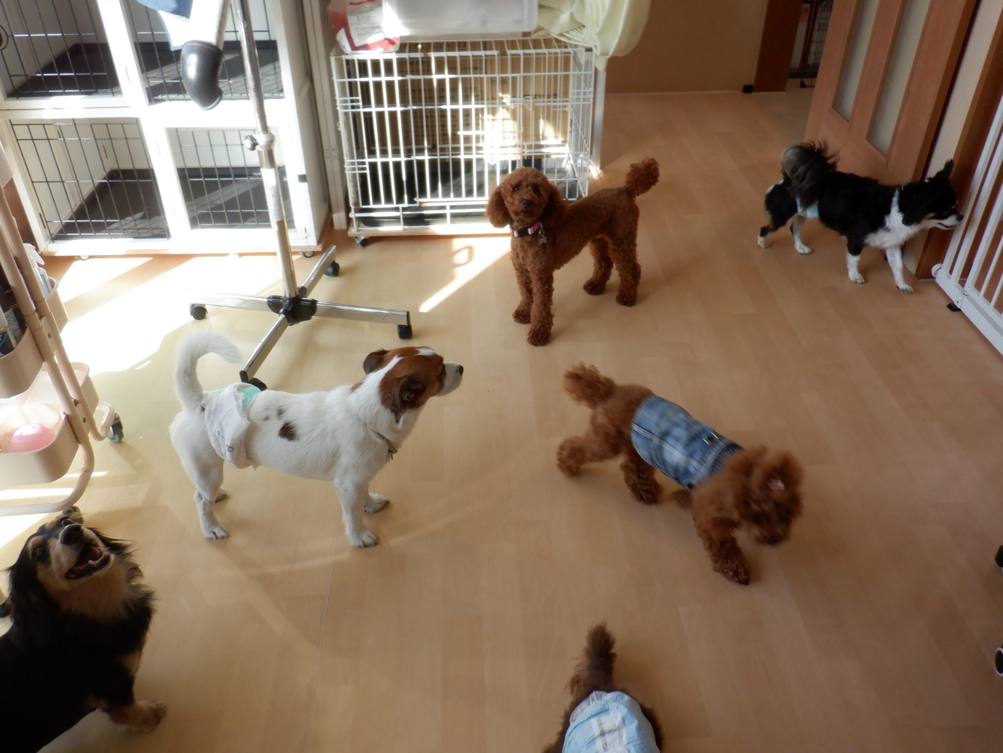 昨日お泊りのワンちゃんたち(マナカ、プルート、ウタ、ルーク、マルク、マイト、アニー、ロン、レオンちゃん)は、朝一番にドッグランで運動です。ご飯のあと、オープンスペースでゆっくり過ごしています。