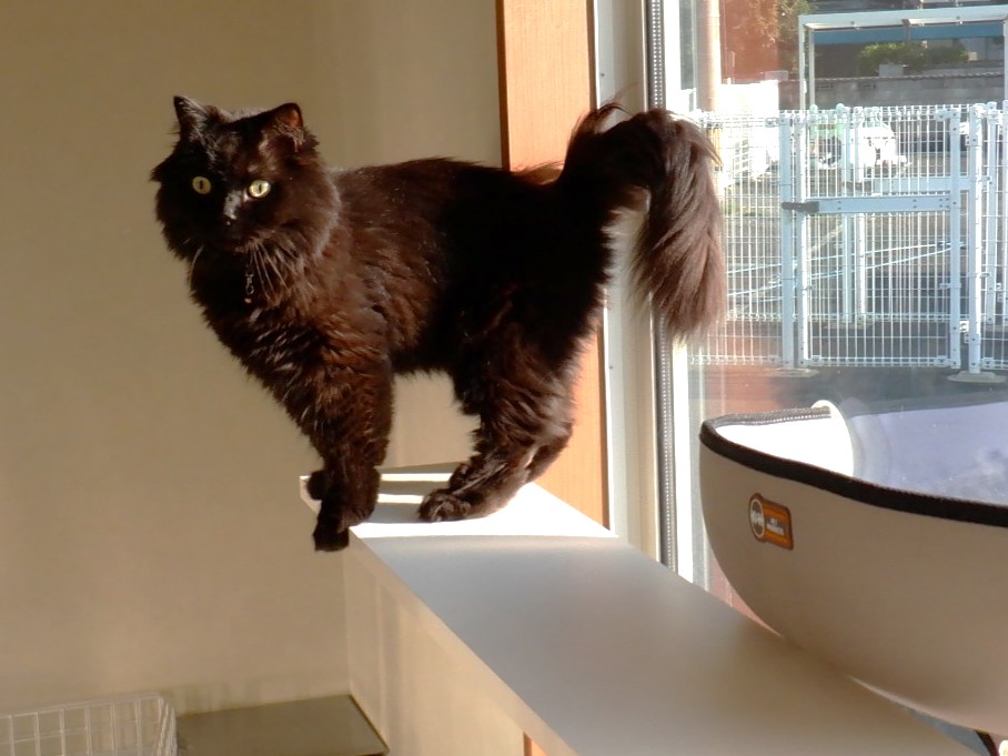 猫室では、カイちゃんがきました。お泊りしたレオちゃんはキャットウォークで遊べました。めるちゃんは「シャー」と言っています。