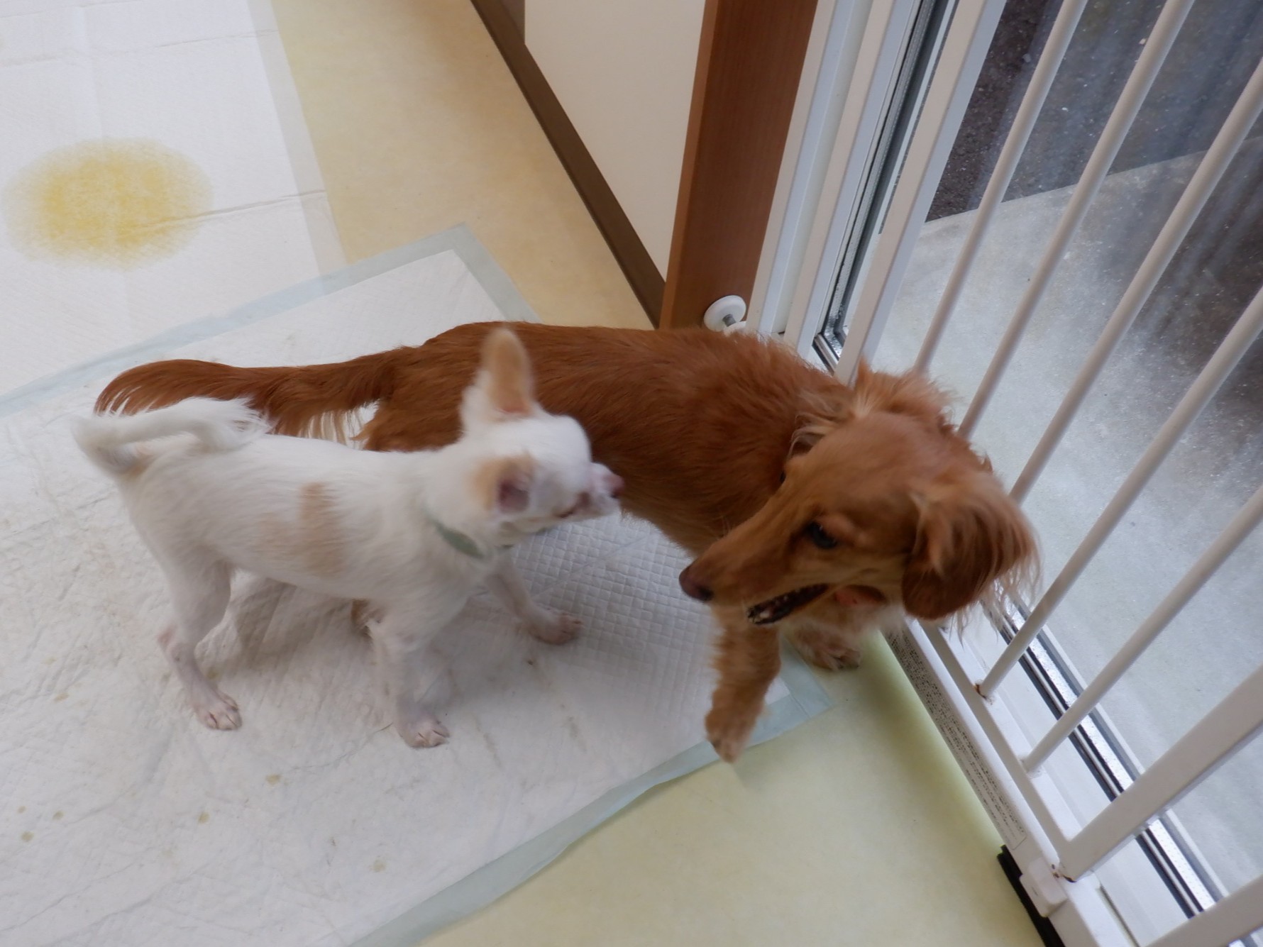 今日のお預かりは、ぽむちゃん・るるちゃん・マロンちゃんです。今日はみんな犬室オープンスペースです。ぽむちゃんとるるちゃんはじゃれ合っています。マロンちゃんはケージの中で大人しくしています。