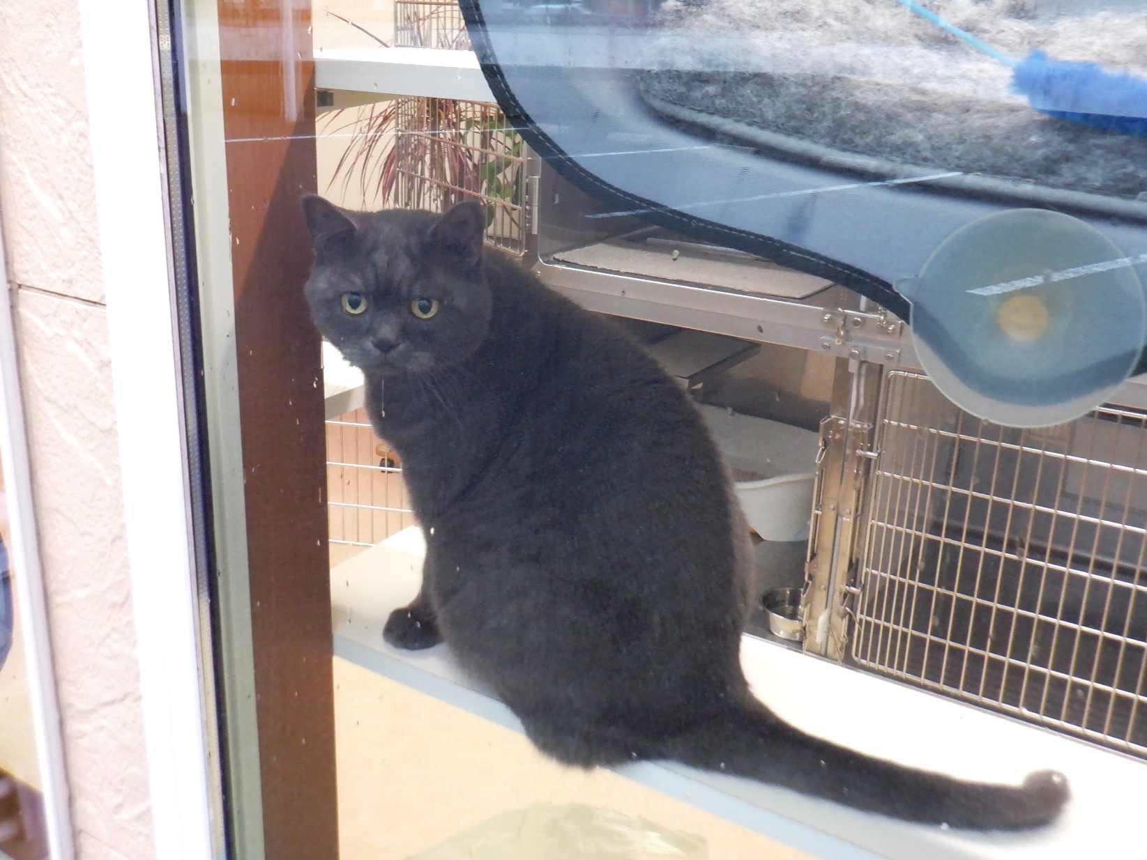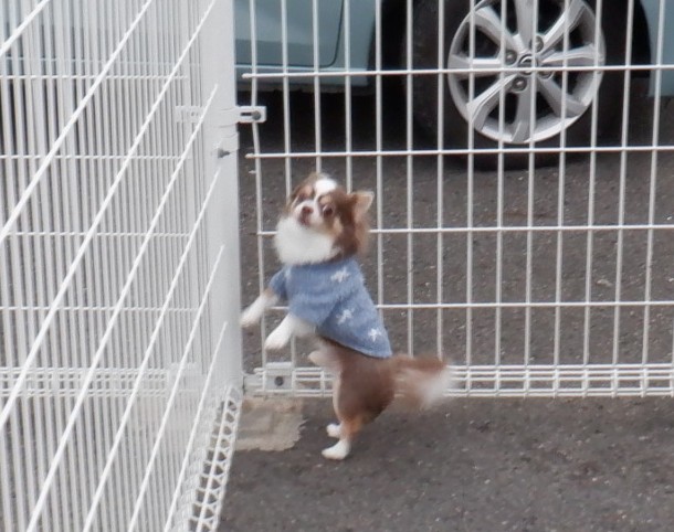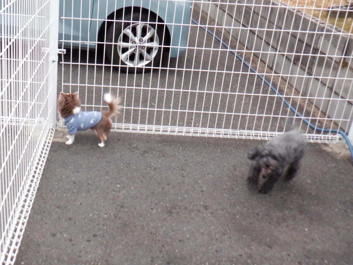 お泊りしたハナちゃんとマルちゃん、雨が降り出す前にドッグランに行けました。カイちゃんはキャットウォークから外を見ています。